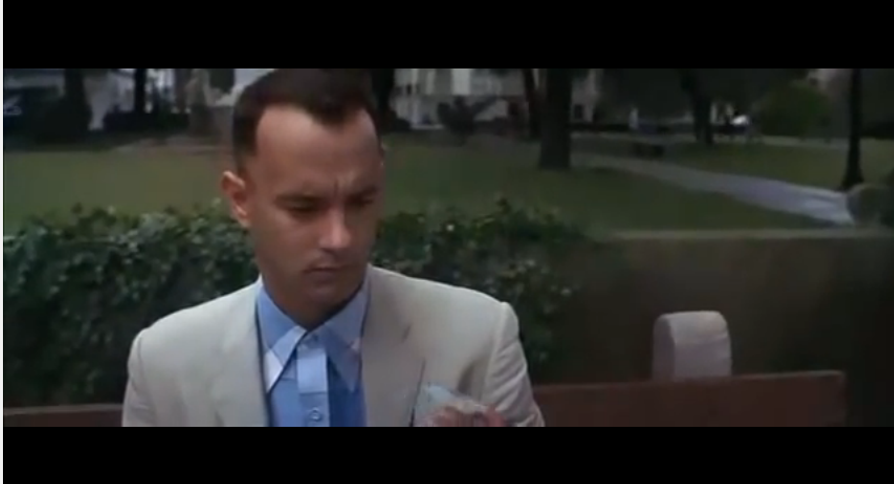 The scene begins with the Paramount Pictures logo on screen, however with no sound, and this stays on screen for a duration of 3 seconds, and at 0:03, 'a Paramount Communications Company' fades in at the bottom of the logo. The logo fades out at 0:07, and at 0:09, the film itself fades in, and we can see a blue screen, which turns out to be the sky, and a feather floating in the centre of the frame. We are then shown our first glimpse of the location, when we begin to see buildings in the shot. This is a unique , yet very clever idea for introducing the set in an interesting way. This feather is the McGuffin of the film, helping further the narrative and keeping the narrative continuing at a good pace. At this point, a piece of music titled 'I'm Forrest...Forrest Gump' starts, as a well choreographed crane shot begins, which continues for most of the duration of the clip. At 0:12, 'Paramount Pictures presents' appears on the screen for a duration of 3 seconds, and the feather can be seen spinning in the background, behind the writing. From 0:17, 'A Steve Tisch/ Wendy Finerman Production', 'A Robert Zemeckis Film' and 'Tom Hanks in' appear consecutively, up until 0:30. At 0:31, the title of the film 'Forrest Gump' is finally shown on screen, in the centre of the frame